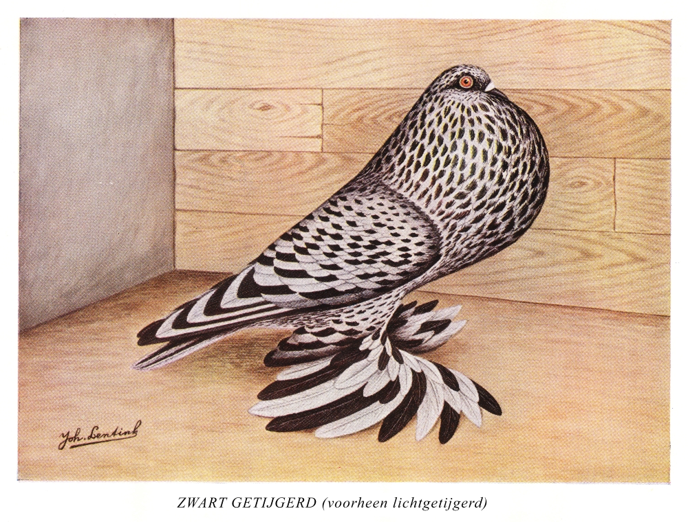 Getijgerd: Over het gehele lichaam, met uitzondering van de voetbevedering, slag- en staartpennen. De romp, kop, hals en het veugelschild zijn bedekt met witte en gekleurde veren door elkaar en zo regelmatig mogelijk verdeeld. Voor de beoordeling is de wit/kleur verdeling in de voetveren, slag- en staartpennen niet zwaarwegend. Hierbij is zowel gekleurd als afwisselend wit en gekleurd toegestaan.