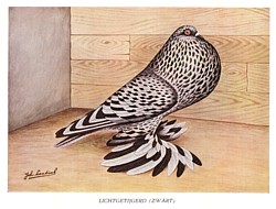 Lichtgetijgerd: Over het hele lichaam witte en gekleurde veren, door elkaar en zo regelmatig mogelijk verdeeld.