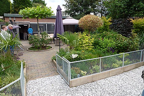 Een prachtig aangelegde tuin (ontwerp van zijn vrouw), gezellige zitjes bij en onder parasols maakten er een fraai geheel van. Appie, enthousiast als altijd, leidde ons ronde n zijn vrouw verzorgde de koffie of iets anders.