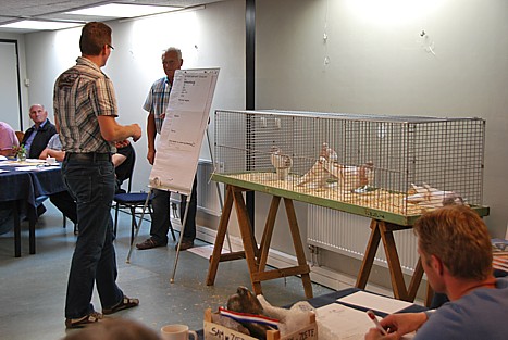 Aan de hand van 4 Geelzilverbonten en een zeer vergrote nieuwe beoordelingskaart heeft Fedde de zaal uitgedaagd mee te oordelen over positieve punten, wensen, fouten en uitsluitingen.