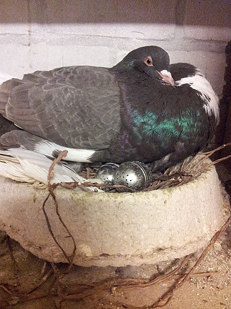 2 dagen voor de uitkomst van de eieren, dus op de 18e dag van het broeden, gerekend vanaf de datum van leggen van het 1e ei, halen we de eieren weer uit het thee-ei en leggen ze weer onder de duiven in de nestschaal.